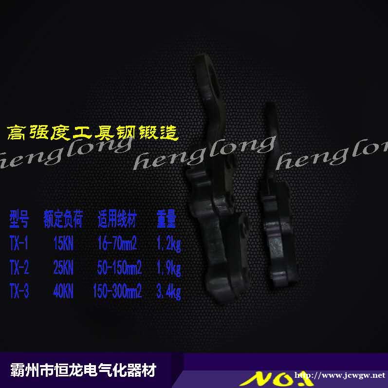3)适用范围大。可以适用钢绞线,也可适用钢芯铝绞线。适用导线/地线截面50-150 mm2(直径9-17mm)mm),额定拉力20KN,安全系数3,**拉力60KN,重量1.3kg